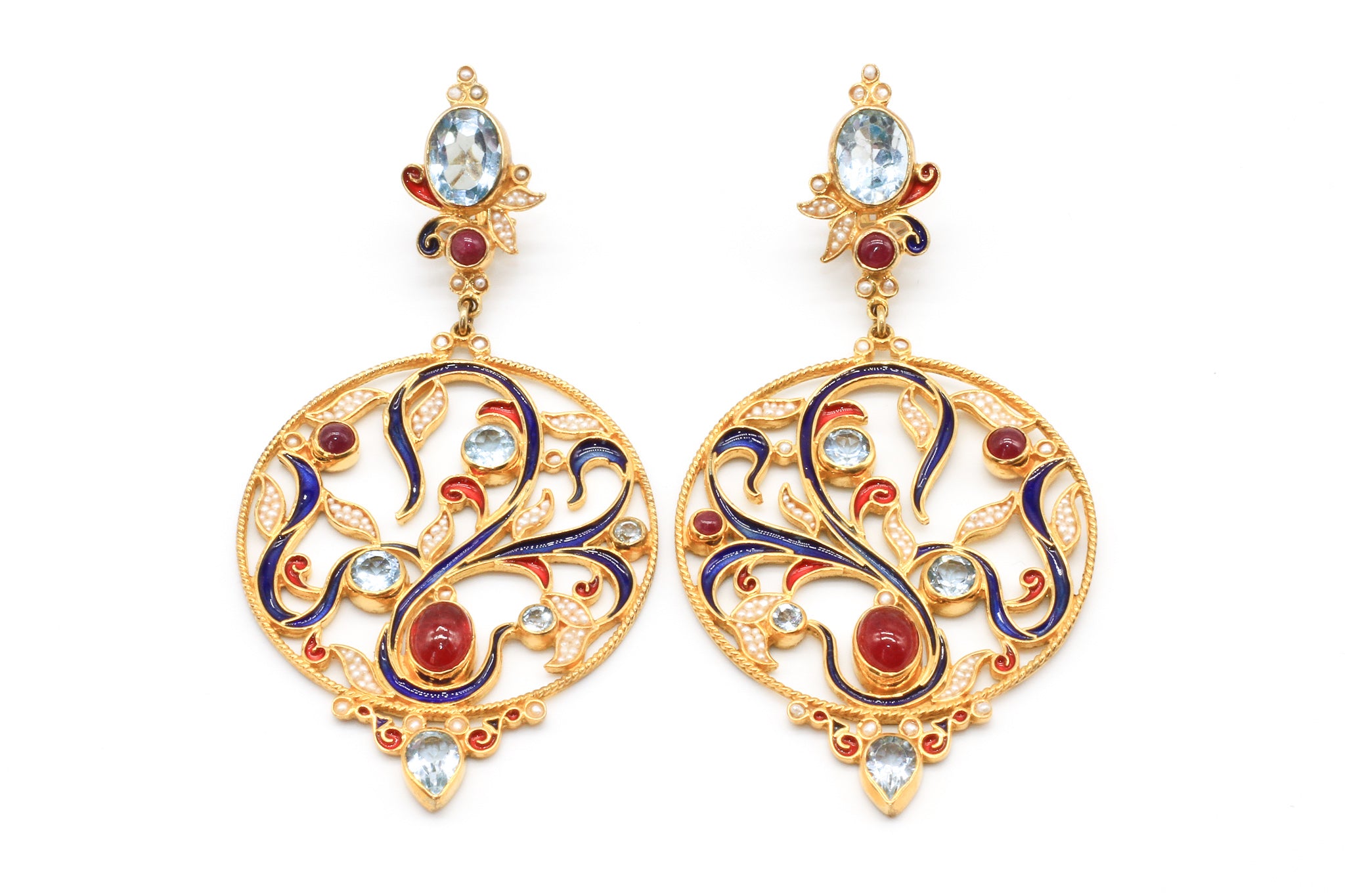- Made with enamel in cloissone technique, with Ruby and Blue Topaz and micromosaic of seedpearls